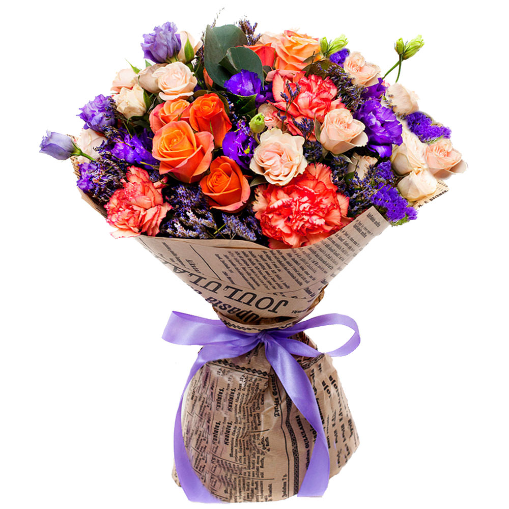 Роза одноголовая, гвоздика, эустома, статица, роза кустовая.